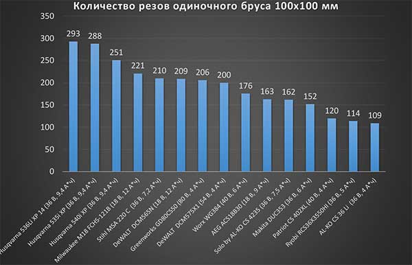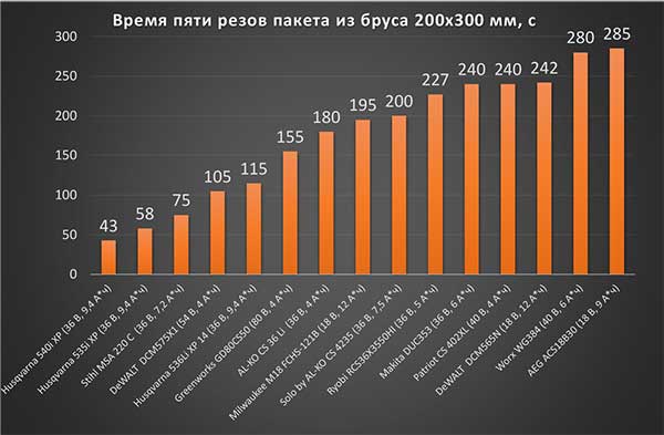 Конечно, интересно сравнить с тем, что у нас получилось в прошлом году. Батарея та же самая, характер работы такой же, одна из пил — почти та же, с какими-то изменения ми в электронике, другая — совершенно новая. Смотрим результаты. Они показаны и на -диаграммах, но для удобства продублируем их текстом с нашими пояснениями. Предыдущую модель, Husqvarna 536Li XP, тоже показана на диаграммах — для удобства сравнения. А вот в нашем рейтинге «Топ-5 самых производительных аккумуляторных пил» она не участвует, именно этим объясняется разница между рейтингом и диаграммой с временем пяти резов пакета. На одиночном брусе Husqvarna 535i XP сделала 288 полных резов за 20 минут. Результат Husqvarna 540i XP — 251 рез, 14,5 минуты. Аккумулятор в обоих случаях разряжен полностью, без перегрева. На пакете Husqvarna 535i XP выполнила 52 полных реза за 14 с небольшим минут (14 минут 13 секунд, если уж быть совсем точным). Husqvarna 540i XP — 48 резов, время выполнения — 10 минут 10 секунд.